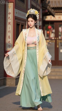 masterpiece, best quality, A beautiful girl in Song - style Hanfu wears a goose - yellow front - opening long gown, with a light - pink Song - style bustier inside and a green pleated skirt. The cuffs of the long gown are embroidered with tender - yellow winter jasmine flowers, and the pleats of the pleated skirt are delicate. She is in the bustling Bianjing night market, curiously looking at the dazzling array of stalls around. The night market is ablaze with lights, and the crowd is bustling, full of the lively atmosphere of the marketplace, (huge breasts, full breasts:2.99)Xbigbreasts,XbaifengsongyuYH,,Xxiapeisongzhihanfu,Xsongzhihanfuxiapei,Xnangongjin,Xnangongjin2