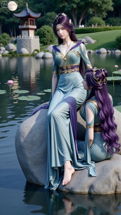 Best quality, Realistic, a woman with long, wavy purple hair is seated on a large gray rock. She is dressed in a light blue dress with a purple belt around her waist. Her dress is adorned with a flower in her hair, adding a touch of beauty to the scene. In the background, a pagoda-like structure stands out against a backdrop of trees and a moon.,(big breasts:2.89),(Lotus, lotus pond:1.69),,Xbigbreasts,XbaifengsongyuYH,XzhenniteH,,XhanyunzhiX,Xzhaoxinmeng,XhanyunzhiXM,XhanyunzhiXY,XliuyuY,XliuyuYH,XhnayunzhiXYH