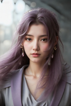 该图像的特征是一个长长的紫色的头发,流向框架的左侧,暗示运动(可能是风)。他们的眼睛大而棕色,直接凝视着相机,表达平静,表情。化妆很柔软,带有浅色底座和柔软的粉红色唇色,可补充整体外观。他们戴着长而悬空的耳环:右耳环(从观看者的角度来看)具有泪珠形状,底部有粉红色的宝石,而左耳则更复杂,具有金色的细节和另一个粉红色的宝石。该人穿着结构化的浅灰色西装外套,带有折叠的衣领,其褶皱和线条为织物增添了质感。背景是模糊的,柔和,散布的光线和模糊的形状暗示了城市环境(可能是建筑物或结构),从而产生了浅水深度,从而使对象关注该主题。照明是柔软而自然的,可以增强对象的特征而没有刺耳的阴影,整体成分集中在面部和上身上,强调了头发,耳环和衣服的细节。