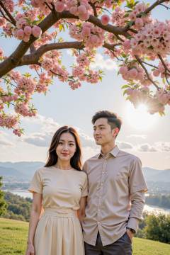 The photo shows two Chinese lovers standing side by side beneath a peach tree. The tree is in full bloom,bearing many large peaches. The woman on the left wears a light-colored,short-sleeved dress with a belt around her waist; the man on the right wears a light-colored button-down shirt and dark pants. Both stand on a grassy field,with mountains and a river in the background and the sun and some clouds in the sky.,
