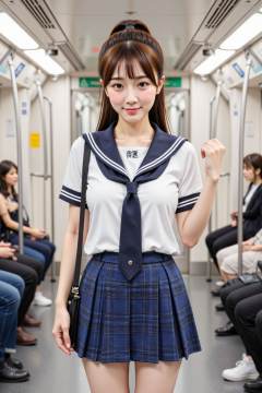This is a highly detailed image of a girl standing in a modern,well-lit subway car. She has fair skin,large brown eyes,and long brown hair tied in a ponytail and blush, nose blush, small smile. She is dressed in a white sailor-style school uniform with a navy collar and tie,and a short blue plaid skirt. She carries a black bag over her shoulder. The background shows other passengers and a clean,orderly interior. The image is highly realistic,with a focus on the woman's cute,youthful appearance.,