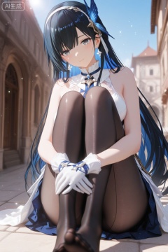 depth of field,light particles,lens flare,masterpiece,best quality,absurdres,newest,very aesthetic,amazing quality,highres,light particles,lens flare,motion blur,dutch angle,masterpiece,best quality,amazing quality,lazypos,lazyup,high detail,subtle,high contrast,real background,smooth shading,glossy surfaces,colorful depth,enthusiasm,diagonal angle,high angle,dak depth,masterful shading,low kye,dak depth,chiaroscuro,impasto,(shallow depth of field:1.4),(foreshortening:1.4),((artist:reoen),(artist:fuzichoco),(artist:atdan),(artist:torino_aqua:0.5),year 2024:0.5),(artist:omone_hokoma_agm:0.8),2d,anime,from above,dutch angle,1girl,solo,long hair,breasts,looking at viewer,bangs,blue eyes,black hair,hair ornament,gloves,dress,bare shoulders,closed mouth,blue hair,flower,multicolored hair,hairband,sleeveless,white gloves,two-tone hair,sleeveless dress,colored inner hair,detailed eyes,black pantyhose,sitting,feet, toes,outdoors,blue sky,sunlight,day,from above,hugging own legs,selena,gentle smile,parted lips,shiny skin,dutch angle