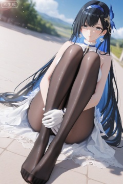 depth of field,light particles,lens flare,masterpiece,best quality,absurdres,newest,very aesthetic,amazing quality,highres,light particles,lens flare,motion blur,dutch angle,masterpiece,best quality,amazing quality,lazypos,lazyup,high detail,subtle,high contrast,real background,smooth shading,glossy surfaces,colorful depth,enthusiasm,diagonal angle,high angle,dak depth,masterful shading,low kye,dak depth,chiaroscuro,impasto,(shallow depth of field:1.4),((artist:reoen),(artist:fuzichoco),(artist:atdan),(artist:torino_aqua:0.5),year 2024:0.5),(artist:omone_hokoma_agm:0.8),2d,anime,from above,dutch angle,1girl,solo,long hair,breasts,looking at viewer,bangs,blue eyes,black hair,hair ornament,gloves,dress,bare shoulders,closed mouth,blue hair,flower,multicolored hair,hairband,sleeveless,white gloves,two-tone hair,sleeveless dress,colored inner hair,detailed eyes,black pantyhose,sitting,feet, toes,outdoors,blue sky,sunlight,day,from above,hugging own legs,selena,gentle smile,parted lips,shiny skin,perfect feet