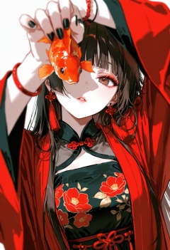 gomzi,hiten,na tarapisu153,nardack,1girl,solo,looking at viewer,hanfu,black nails,nail polish,jewelry,upper body,makeup,long sleeves,blunt bangs,earrings,closed mouth,eyeshadow,hand up,expressionless,parted lips,arm up,wide sleeves,red theme,fingernails,white background,goldfish,eyelashes,brown eyes,close-up,peeking out,simple background,eyeliner,red background,curtains,pale skin,straight hair,red eyeshadow,eyebrows hidden by hair,blending,floral print,bracelet,chinese zodiac,floral print,tassel,chinese clothes,auspicious cloud pattern,one eye covered,two-tone dress,see-through clothes,dynamic pose,dynamic composition,gold_foil,masterpiece,best quality,amazing quality,lazypos,lazyup,high detail,subtle,high contrast,real background,smooth shading,glossy surfaces,colorful depth,enthusiasm,diagonal angle,high angle,dak depth,masterful shading,low kye,dak depth,chiaroscuro,impasto,(shallow depth of field:1.4),(foreshortening:1.4),