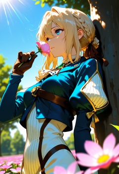 best quality,masterpiece,absurdres,newest,(narrative-rich composition),(japani style:1.35),(niji psyp style:0.55),(yoneyama mai:0.9),(lifeline \(a384079959\):0.7),dramatic angle,dynamic angle,dynamic pose,high-key lighting,volumetric lighting,light rays,soft lighting,solo,1girl,violet evergarden,breasts,shirt,blonde hair,long sleeves,gloves,holding,ribbon,jewelry,jacket,white shirt,upper body,flower,outdoors,small breasts,sky,day,puffy sleeves,medium hair,hand up,blurry,blue sky,tree,ascot,blurry background,depth of field,leaf,blue jacket,sunlight,juliet sleeves,brooch,pink flower,brown gloves,holding flower,layered sleeves,shade,short over long sleeves,dappled sunlight,brown ribbon,shoulder belt,wind,looking away,masterpiece,best quality,amazing quality,lazypos,lazyup,high detail,subtle,high contrast,real background,smooth shading,glossy surfaces,colorful depth,enthusiasm,diagonal angle,high angle,dak depth,masterful shading,low kye,dak depth,chiaroscuro,impasto,(shallow depth of field:1.4),(foreshortening:1.4),
