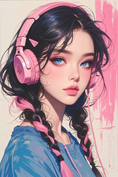 外貌特征:她有着一头乌黑的长发,发间巧妙融入粉色挑染,编成两条俏皮的辫子,自然垂落,为整体造型增添了灵动与俏皮感。她戴着一副玫粉色的头戴式耳机,耳机上印有文字细节,彰显个性。妆容精致,蓝色的眼眸清澈明亮,眼妆部分采用了粉色系眼影,与头发的挑染颜色相呼应,睫毛纤长卷翘,搭配粉嫩的唇色,显得十分甜美且富有青春气息。