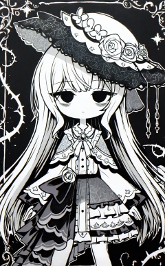 masterpiece,highres,absurdres,newest,best quality,loli,petite,high quality,chromatic_aberration,//,tsukishiro_yuki,1girl,long_hair,solo,hat_flower,flower,rose,stitches,looking_at_viewer,dress,monochrome,frills,straight-on,frilled_hat,hat,bags_under_eyes,expressionless,black_background,very_long_hair,sidelocks,closed_mouth,greyscale,brooch,hat_ornament,long_sleeves,frilled_capelet,simple_background,halo,frilled_dress,chibi,buttons,jewelry,capelet,traditional_media,white_rose,veil,straight_hair,ascot,thorns,star_\(symbol\),lace_trim,//,//,<lora:tsukishiro_yuki2——【noob】hans:1>,