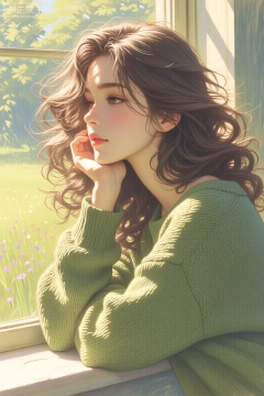 - 人物形象:画中女性有着一头蓬松的棕色卷发,发丝自然垂落,显得温柔又富有活力。她面容姣好,侧脸轮廓优美,眼眸看向窗外,神情宁静而悠远,仿佛沉浸在美好的思绪中。她穿着一件绿色的针织毛衣,毛衣质地柔软,纹理清晰,宽松的版型增添了几分慵懒与舒适感。