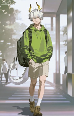 Small note art style,,xiaozhitiao,yu xuan,multicolored hair,White dragon tail,White dragon horns,yellow eyes,white hair,blonde hair,1boy,bangs