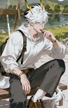 (artist:mazjojo:0.53),(artist:pigeon666:0.37),(artist:zawar379:0.57),(artist:remsrar:0.35),(artist:yoneyama mai:0.64),(yokoyari mengo:0.6),(colored pencil medium),(rei sanbonzakura),(flat color:1.2),masterpiece,best quality,highres,absurdres,extremely detailed,amazing quality,very aesthetic,ultra - detailed,scenery,depth of field,volumetric lighting,high definition,detailed eyes,detailed beautiful face and eyes,best aesthetic,good colors,bright skin,lots of details,1boy,male focus,artistic look,fair skin,slender build,Anime style,(concentrated expression:1.3),(sketching a landscape in the park:1.2),(intense eyes),sitting on a bench in a park, a beautiful landscape of a lake and trees in front of him,(dynamic pose:holding a sketchbook on one knee, a pencil in hand),wearing a beige hoodie with a brown leather patch on the elbow, brown corduroy pants, brown leather shoes,a set of colored pencils in a pouch beside him,a beret on his head,a small easel set up nearby, intricate details,hoodie and corduroy - pants details,soft park lighting,cel - shading,anime key visual,ultra HD,8k,Phainon