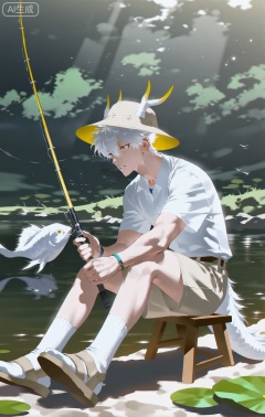 (artist:mazjojo:0.53),(artist:pigeon666:0.37),(artist:zawar379:0.57),(artist:remsrar:0.35),(artist:yoneyama mai:0.64),(yokoyari mengo:0.6),(colored pencil medium),(rei sanbonzakura),(flat color:1.2),masterpiece,best quality,highres,absurdres,extremely detailed,amazing quality,very aesthetic,ultra - detailed,scenery,depth of field,volumetric lighting,high definition,detailed eyes,detailed beautiful face and eyes,best aesthetic,good colors,bright skin,lots of details,1boy,male focus,patient look,fair skin,slender build,Anime style,(attentive expression:1.3),(fishing by the lake:1.2),(steady eyes),sitting on a small stool by a peaceful lake, a fishing rod in hand, a tackle box beside him, lily pads floating on the water,(dynamic pose:leaning forward slightly, watching the fishing line),wearing a light - blue short - sleeved fishing shirt with a fish - scale pattern, khaki shorts, brown leather sandals,a wide - brimmed fishing hat on his head, a pair of polarized sunglasses,a small cooler filled with bait and drinks nearby, intricate details,fish - scale shirt and tackle - box details,soft lake - side lighting,cel - shading,anime key visual,ultra HD,8k,Phainon