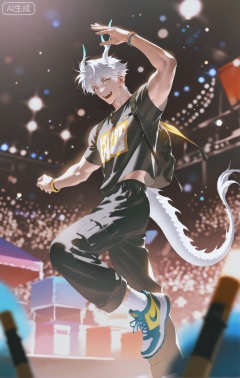 (artist:mazjojo:0.53),(artist:pigeon666:0.37),(artist:zawar379:0.57),(artist:remsrar:0.35),(artist:yoneyama mai:0.64),(yokoyari mengo:0.6),(colored pencil medium),(rei sanbonzakura),(flat color:1.2),masterpiece,best quality,highres,absurdres,extremely detailed,amazing quality,very aesthetic,ultra - detailed,scenery,depth of field,volumetric lighting,high definition,detailed eyes,detailed beautiful face and eyes,best aesthetic,good colors,bright skin,lots of details,1boy,male focus,energetic look,rosy - cheeked skin, athletic build,Anime style,(excited expression:1.3),(dancing at a music festival:1.2),(sparkling eyes),in the middle of a large, crowded 音乐节,a huge stage with a band performing, colorful lights flashing everywhere,(dynamic pose:jumping up and down, hands in the air),wearing a black short - sleeved band - inspired shirt with glow - in - the - dark prints, neon - colored cargo pants, black and neon - colored sneakers,a multicolored, fringed scarf tied around his waist,a pair of glow - sticks in his hands,a backpack with music - festival patches, intricate details,band - shirt and cargo - pants details,bright stage lighting and colored lights,cel - shading,anime key visual,ultra HD,8k,Phainon