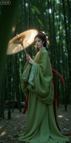Please cool down,beauty,This is a highly detailed, high-resolution photograph featuring a young woman in traditional East Asian attire, likely inspired by Chinese or Japanese culture. She stands in a serene bamboo forest, bathed in soft, golden light that filters through the dense foliage. Her skin is fair with a slight blush, and she has delicate features, including a small, pointed nose and full lips. Her hair is styled in an intricate updo, adorned with ornate hairpins and a small, decorative hairpiece that hangs down her back.She wears a long, flowing green robe with wide sleeves and intricate patterns, which contrasts beautifully with the natural green surroundings. The robe is made of a smooth, silky fabric that drapes elegantly around her body. A red sash ties around her waist, adding a pop of color to the ensemble. She holds a large, open parasol above her head, casting a soft, warm glow around her. The parasol is made of a translucent material, allowing some light to filter through while providing shade.The background is a lush bamboo forest with tall, slender bamboo stalks and greenery that extends into the distance. The ground is covered in a layer of dry leaves and dirt, adding to the natural, untouched feel of the setting.