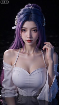 1girl, solo, long hair, red lips,looking at viewer, upper body, glowing hair,hair ornament,white sling shirt,bare shoulders,in water,hair bun,ribbon,earrings,black background,light,dark background