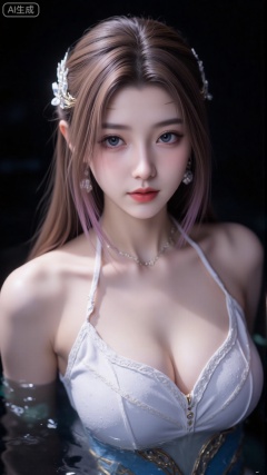 1girl, solo, long hair, red lips,looking at viewer, upper body, glowing hair,hair ornament,white sling shirt,bare shoulders,in water,hair bun,ribbon,earrings,black background,light,dark background