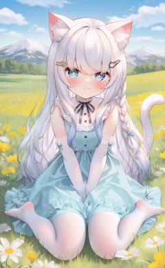 best, 1girl, white pantyhose, cat ears, animal ears, outdoors, sitting, gloves, dress, cat girl, solo, tail, cat tail, pantyhose, blue eyes, white hair, flower, animal ear fluff, white gloves, blue dress, long hair, wariza, elbow gloves, braid, sleeveless, looking at viewer, no shoes, field, sky, day, smile, ribbon, sleeveless dress, blush, grass, hair ornament, hairclip, on grass, flower field, yellow flower, cat hair ornament, cloud, closed mouth, between legs, black ribbon, hand between legs, neck ribbon, frills, full body, white flower, blue sky, side braid, +_+, very long hair, frilled dress, hair bow, bow, mountain, single braid, hair between eyes, feet <lora:Nai4 gzc_mix-000055:1>