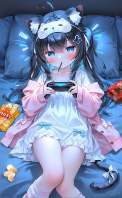 masterpiece,absurdres,best quality,high quality,chromatic_aberration,night,darkness,black theme,photorealistic,high contrast,high saturation,loli,loli,loli,//,sleep mask, 1girl, controller, animal ears, heart tail, cat tail, tail, blue eyes, game controller, cat girl, cat ears, food, mask on head, striped socks, virtual youtuber, sleeves past wrists, holding controller, long hair, pink cardigan, sleeves past fingers, eye mask, cardigan, black hair, looking at viewer, solo, heart, mask, mouth hold, holding game controller, animal ear fluff, holding, open cardigan, hair ornament, socks, white dress, pocky, tail ornament, chips (food), food in mouth, ahoge, dress, blush, hair between eyes, pillow, pocky in mouth, striped clothes, long sleeves, bow, notice lines, two side up, lying, open clothes, signature, potato chips, bag of chips, on back, loose socks, feet out of frame, loungewear, pink jacket, tail bow, heart ahoge, leg warmers<lora:Nai4 gzc_mix-000055:1>