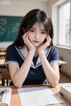 Masterpiece, the best quality, high quality, small breasts,,(black hair:1.4),(long legs:1.3),(thin legs:1.4), 1girl, the warm sunlight shines into the classroom, sitting by the window table, a gentle and kind girl sitting in front of the table, the hidden blue paired with white summer lapel short-sleeved school uniform made her feel refreshed and refreshed. She leaned forward to the camera (the sense of perspective makes her face look big). The girl’s narrow face was inlaid with bright eyes, looking at the camera warmly, her slender hands raised and held tightly, holding the hands stretched out from the bottom of the picture and pressed on her face. On the table were thick books, flat test papers and stationery, etc., macro close-up, her hands and faces were sticking together, and she had enough light to illuminate the delicate facial features