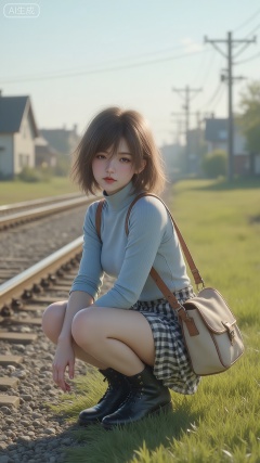 A young woman in a realistic CG style, with light brown medium - length hair that is smooth and has a natural luster. Under the side light of the warm sunlight, each strand of hair clearly shows delicate texture and slight dynamic undulation. She is wearing a light blue knitted top: the fabric is soft and has a matte texture, forming a soft light - dark transition under the light. It is matched with a checkered short skirt, where the fabric texture is clear and the folds are natural. A beige canvas bag is slung over her shoulder: the fabric texture is real, and the metal fasteners have a delicate matte luster. The black leather ankle boots on her feet have a smooth leather surface, reflecting soft ambient light and shadow, with exquisite stitching details. She squats on the grass beside the railway: the grass leaves are slender and have natural light - shadow layers, and the gravel on the ground is distinct in particles with rough and real texture. The background is an extended railway track: the metal track has a cold matte finish, the texture of the sleepers and gravel is clear, and the houses and telephone poles in the distance have soft outlines under the warm sun, with the sky showing a clear light blue. The overall light is warm side - backlight, creating a richly layered light - shadow effect on the hair, knitted fabric, checkered fabric, canvas, leather, grass leaves, and metal tracks. The textures of various materials (hair, knitted fabric, checkered fabric, canvas, leather, grass leaves, metal tracks, gravel) are accurately restored, fully demonstrating the delicacy of realistic CG and the fresh atmosphere of the spring countryside.