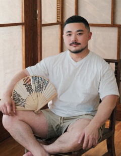 XLCNIBOBO, solo, looking at viewer, short hair, shirt, black hair, 1boy, holding, sitting, white shirt, male focus, shorts, indoors, feet out of frame, facial hair, chair, thick eyebrows, muscular male, bara, hand fan, beard, mature male, realistic, mustache, very short hair, photo background, leg hair, arm hair, reference inset  <lora:SDXL.亚洲百福萌XLCNIBOBO9:0.86>