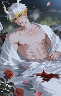 (artist:mazjojo:0.53),(artist:pigeon666:0.37),(artist:zawar379:0.57),(artist:remsrar:0.35),(artist:yoneyama mai:0.64),(yokoyari mengo:0.6),1boy,male - focus,upper - body - nude,white - ribbon,fluttering,white - robe,hot - spring,steam - rising,roses,numerous,red - roses,petals - scattered,wine - glass,red - wine,spilled,tears,tear - streaked,red - rimmed - eyes,afraid,frightened,expression,bleeding,bleeding - wound,arm - bleeding,chest - scratch,skin - cut,moonlight,night - scene,shadowy,soft - glow,stone - edge,hot - spring - edge,grass,green - grass,ground - cover,vine - wrapped,rose - vines,entwined,fragrance,rose - fragrance,blood - drops,droplets,quivering,shaking,slumped - posture,seated,trembling,hands - shaking,fright - stricken,fear - filled,red - hue,wine - stain,stained - robe,blood - smear,skin - pallor,pale - skin,moist - skin,dewy,mist - covered,hot - spring - mist,tense - muscles,shoulder - tension,jaw - clench,lip - quiver,fright - visible