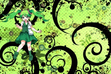 1 green hair girl jumping in the picture , Frutiger Metro,illustration,vibrant,abstract design,circles and rings,intricate dots and swirls,visually striking,black swirls and curves,dynamic swirling patterns,sense of movement, polka dots,varying dot sizes,unique and captivating abstract image,anime ,3d_art