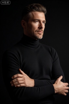 A mature and stylish man in his 30s, with a tough outline and short, stylish haircut, stands in a contemplative posture. His silhouette is against a pure black background, emphasizing his form. The composition focuses on his face, hands, and tight-fitting black turtleneck. High contrast light and shadow create a mysterious atmosphere, enhancing the texture of his clothing. The picture style is simple and high-end, with a strong sense of light and shadow, highlighting the materials and fit of his clothes. No excess decoration; the background remains pure black.xnz,omxn