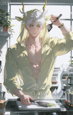 (artist:mazjojo:0.53),(artist:pigeon666:0.37),(artist:zawar379:0.57),(artist:remsrar:0.35),(artist:yoneyama mai:0.64),(yokoyari mengo:0.6),1boy,male focus,solo,short, spiky hair,hooded pajamas,hood up, a green silk scarf tied around his neck, muscular abs on display as he stands in a messy kitchen. He's holding a spatula in one hand, looking at a pan on the stove with a mix of determination and uncertainty. There are ingredients scattered on the counter, and a half - chopped onion sits next to a cutting board.