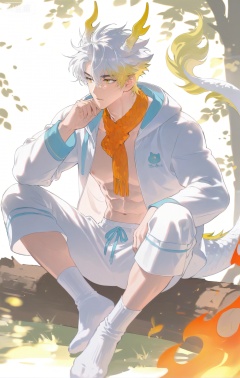 Small note art style,,xiaozhitiao,yu xuan,multicolored hair,White dragon tail,White dragon horns,yellow eyes,white hair,blonde hair,1boy,bangs