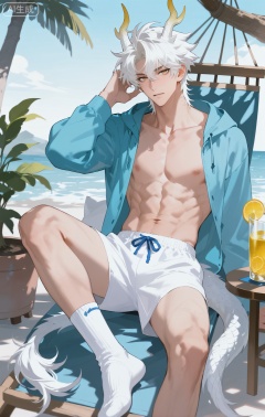 (artist:mazjojo:0.53),(artist:pigeon666:0.37),(artist:zawar379:0.57),(artist:remsrar:0.35),(artist:yoneyama mai:0.64),(yokoyari mengo:0.6),1boy,male focus,solo,medium - length wavy hair,hooded pajamas,hood down, a light - brown knitted scarf draped over his shoulders, his toned abs visible as he dozes off in a hammock on a wooden patio. The hammock is strung between two posts, and there's a small side table with a half - read book and a glass of lemonade. Potted ferns line the edges of the patio, and the afternoon sun casts a warm, yellow glow.