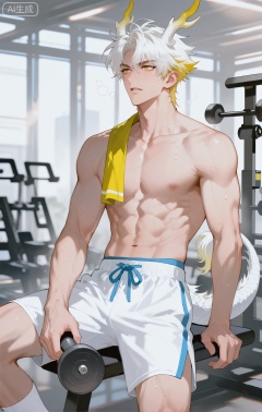 (artist:mazjojo:0.53),(artist:pigeon666:0.37),(artist:zawar379:0.57),(artist:remsrar:0.35),(artist:yoneyama mai:0.64),(yokoyari mengo:0.6),1boy,male focus,solo,short, sweaty hair,hooded pajamas removed and tied around his waist, a neon - colored sports scarf around his neck, well - defined abs glistening with sweat as he takes a break from his workout. He's sitting on a bench in a well - equipped gym, with weights, exercise machines, and mirrors all around. There are other people working out in the background, and motivational posters adorn the walls.