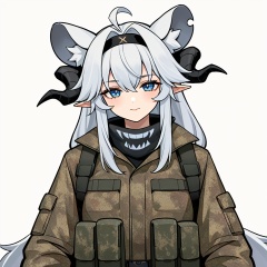 masterpiece, best quality,solo,(white background:1.2),simple background,1girl,looking at viewer,        dajiaoshu_style,shuangweihuixing,rat ears,horns,blue eyes,animal ears,closed mouth,ahoge,white hair,2 tails,animal ear fluff,demon tail,demon horns,long hair,gloves,jacket,hairband,black gloves,virtual youtuber,camouflage,camouflage jacket<lora:双尾彗星-1.0-ill2pro:0.8>