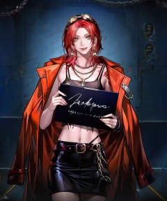 masterpiece,best quality,<lora:wqmt-gnoob-Tanger:1>,Path to Nowhere \(video game\),game CG,1girl, solo, goggles, red hair, jewelry, goggles on head, skirt, navel, midriff, necklace, looking at viewer, jacket, black skirt, earrings, breasts, crop top, cleavage, coat, tattoo, cowboy shot, green eyes, medium hair, chain necklace, own hands together, pencil skirt, holding, smile