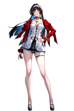8k,best quality,masterpiece,(ultra-detailed),(high detailed skin),masterpiece,best quality,<lora:wqmt-gnoob-Tanger:0.6>,Path to Nowhere \(video game\),game CG,cool,colorful,detailed light,light leaks,sunlight,bokeh,blurry foreground,ray tracing,lens flare,cinematic lighting,full body,full shot,standing,looking at viewer,(solo:1.2),simple background,(white background:1.2),hand on own hip,(white background:1.1),<lora:yaojy-noob-Tanger-000014:0.8>,Astra Yao \(zenless zone zero\),clothes: yjy def white short dress with red jacket,1girl,solo,long hair,red jacket,black hair,jewelry,breasts,hairband,thigh strap,earrings,bare legs,A full-body portrait of a young girl,standing gracefully,pastel art style,high-key lighting,shoujo manga influence,hd quality,delicate details,