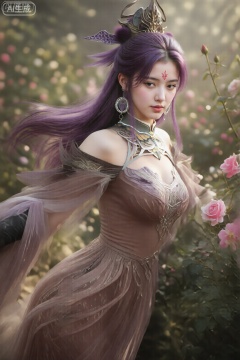 图像中的角色有着长长的、飘逸的紫色头发,有些发丝在风中飘扬。耳朵上挂着大大的圆形耳环,额头上有一个红色标记。司幼幽,