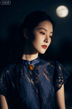 一位女性身着镶着蕾丝的藏青连衣裙,佩戴琥珀胸针,在月光与夜色的明暗交替中,散发着复古温柔的神秘魅力。