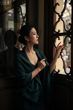 一位女性戴着黑色网纱装饰帽,披着深绿色流苏披肩,在雕有藤蔓花纹的木质窗边远眺,流苏随微风轻晃,光影明暗间透出复古浪漫的韵味。