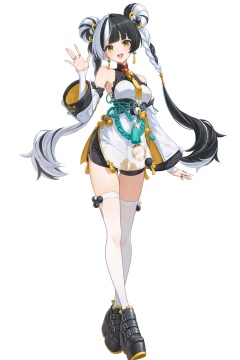 <lora:Dialyn v0.9 illustrious-000032:1>,Dialyn,1girl,solo,thighhighs,dress,chinese clothes,detached sleeves,white thighhighs,jewelry,full body,hair ornament,white dress,twintails,black footwear,smile,braid,standing,twin braids,double bun,open mouth,earrings,white sleeves,shoes,looking at viewer,platform footwear,china dress,black shorts,hair bun,breasts,tassel,medium breasts,shorts,sleeveless,blunt bangs,bare shoulders,bell,long sleeves,side slit,ring,white_background,simple_background,white hair,black hair,two-tone hair,waving,