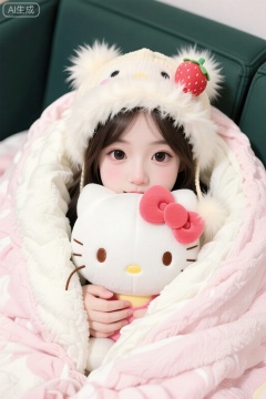 毛绒帽与Hello Kitty玩偶构建双重可爱符号,草莓道具点缀增添甜美气息。深绿座椅背景反衬粉白主色调,毯子褶皱与玩偶胡须等细节丰富触感,营造被柔软物品包围的安全感。