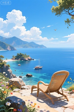 画面的核心主题并非壮阔的海景,而是“观景的体验” 。藤编躺椅是视觉的起点和焦点,它被放置在右下角的黄金分割点附近,这种构图非常巧妙: