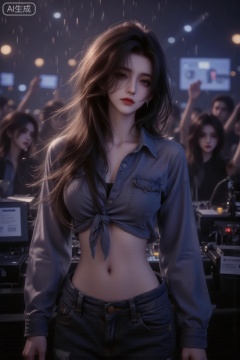 Nightclub girl,1girl, solo,short hair,black hair, navel, brown eyes, hair over one eye,midriff, pants,denim, jeans, realistic, nightclub, lights, dancing, crowd,electronic mixing console during rainfall,blue shirt,Lqiqi