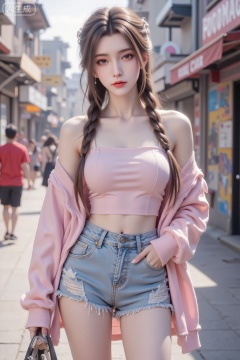 Masterpiece, the best quality, high quality, huge breasts,,(pink hair:1.4),(long legs:1.3),(thin legs:1.4),A cheerful Asian girl enjoying the city vibe, captured in a street photo. She's wearing a tube top, a pink overshirt with a playful pattern, and torn short shorts jeans. Her braided bangs are styled in a trendy way, and her large breasts are accentuated by the fitted top, with a hint of cleavage. Her thighs are smooth and well-proportioned. The street is filled with vibrant street art and young people. The shot is taken from a diagonal angle, adding dynamism to the scene. Photography settings: f/2.8 aperture for a soft, dreamy background blur. The shutter speed is 1/160s to capture her lively expression. Warm, late-afternoon sunlight bathes the scene in a golden hue,Lqiqi