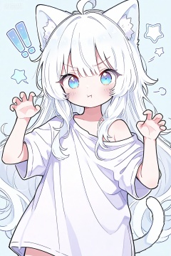 loli, 1girl, solo, long hair, looking at viewer, blush, bangs, blue eyes, simple background, shirt, animal ears, very long hair, closed mouth, tail, white shirt, ahoge, white hair, short sleeves, cat ears, off shoulder, star \(symbol\), v-shaped eyebrows, cat tail, animal ear fluff, hands up, blue background, cat girl, !, :t, pout, claw pose, !!, oversized shirt