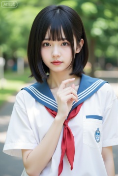 1girl,solo,looking at viewer,short hair,shirt,black hair,closed mouth,school uniform,white shirt,upper body,short sleeves,outdoors,day,serafuku,hand up,blunt bangs,sailor collar,blurry,black eyes,neckerchief,lips,blurry background,depth of field,bob cut,blue sailor collar,red neckerchief,realistic,red lips,asian