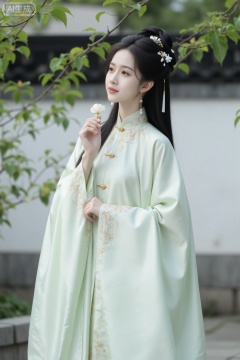 The image is a high-resolution photograph of an East Asian woman in traditional Hanfu attire. She stands against a serene, outdoor background, with a simple white wall and a dark roof, possibly part of a traditional Chinese courtyard. The woman has fair skin and a youthful appearance. Her long, black hair is styled in intricate braids adorned with white and gold hair accessories, including flowers and dangling ornaments.She wears a light mint-green Hanfu robe with wide sleeves, made from a smooth, slightly shiny fabric that appears to be silk. The robe is intricately embroidered with delicate floral patterns in white and gold thread, particularly around the high collar and cuffs. The collar is adorned with more intricate embroidery and gold buttons.In her right hand, she delicately holds a small white flower, which she is about to bring to her lips. Her expression is soft and serene, with a slight smile. The background features green, leafy branches that add a touch of natural beauty t