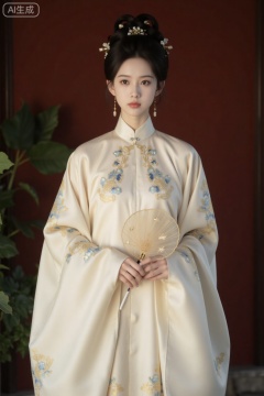 She wears a long-sleeved, high-collared robe made of a smooth, cream-colored fabric adorned with intricate embroidery in gold and blue hues, featuring floral and paisley patterns. The robe is complemented by a matching skirt with a similar design, which flows gracefully down to her feet. She holds a small, round, transparent fan in her right hand, which she appears to be adjusting, adding a touch of movement to the still image.
