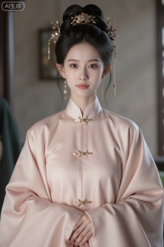 A Ming Dynasty noble female costume with a soft luster flowing throughout, real person, beautiful woman, delicate facial features, and exquisite makeup. Facial high-definition, slender hands, exquisite details, ultra high definition, master works, moderate saturation, fully immersive atmosphere, full body close-up, full body photo
