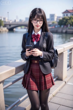 图片记录了身着学院风制服的女性在户外的场景。黑框眼镜与红色蝴蝶结领带衬托出文静气质,酒红色格纹短裙与黑色丝袜搭配双肩包,彰显日系休闲风格。她手持手机站立桥边,背景的水面、远桥与岸边建筑构成宁静的城市景观。居中构图突出人物主体,整体氛围轻松自然,仿佛捕捉了日常出行中的片刻闲暇。