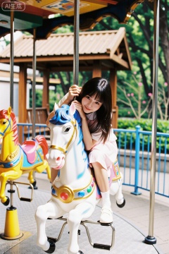 图像捕捉了游乐园中的梦幻瞬间。一位女性骑坐在白色旋转木马上,双手握缰,低头浅笑望向镜头。她身着白衣粉裙,与木马的彩色装饰相映成趣。背景是其他鲜艳木马、木质亭台和绿植,营造出欢快的童话氛围。中心构图突出人物主体,柔和光线与明快色彩共同强化了轻松、怀旧的愉悦感。