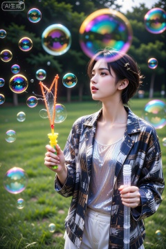画面充满了童趣与光影魅力。人物穿图案外套与亮片内搭,手持泡泡工具,四周飘浮着大小不一的彩虹色泡泡。绿色草地与远树构成自然背景,光线穿透泡泡折射出斑斓色彩。中央偏右的构图使人物与泡泡群形成动感关联,整体氛围轻松愉悦,仿佛冻结了童年夏日最惬意的吹泡泡时刻。